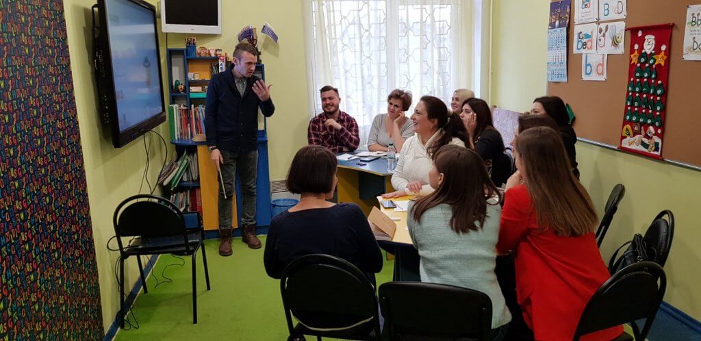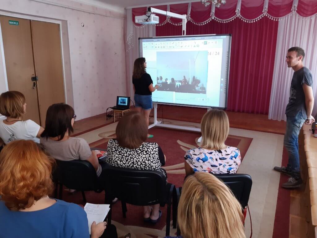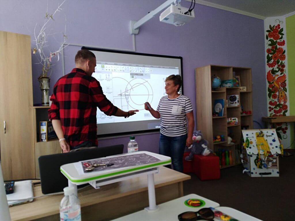 Це відбувається так. Спочатку вчителі слухають, потім споглядають практичне виконання, а далі самі роблять. Хтось один чи декілька охочих виходять до інтерактивної панелі і намагаються втілити ідею в реальний урок. Цей процес контролює спікер, радить як краще та допомагає виправити помилки, якщо такі є.